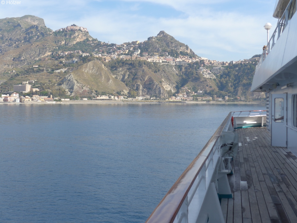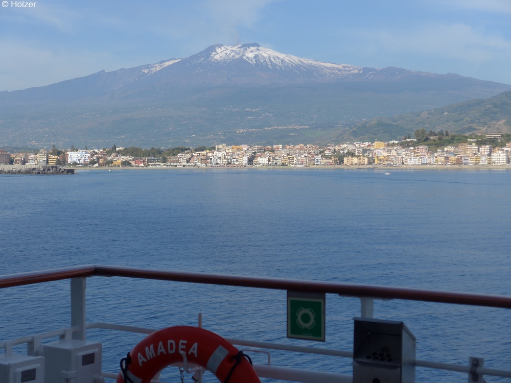 Die AMADEA lag auf Rede in einer Bucht, von wo man einen schönen Blick auf Naxos, das hoch gelegene Taormina und den 3000 Meter hohen Ätna hatte.