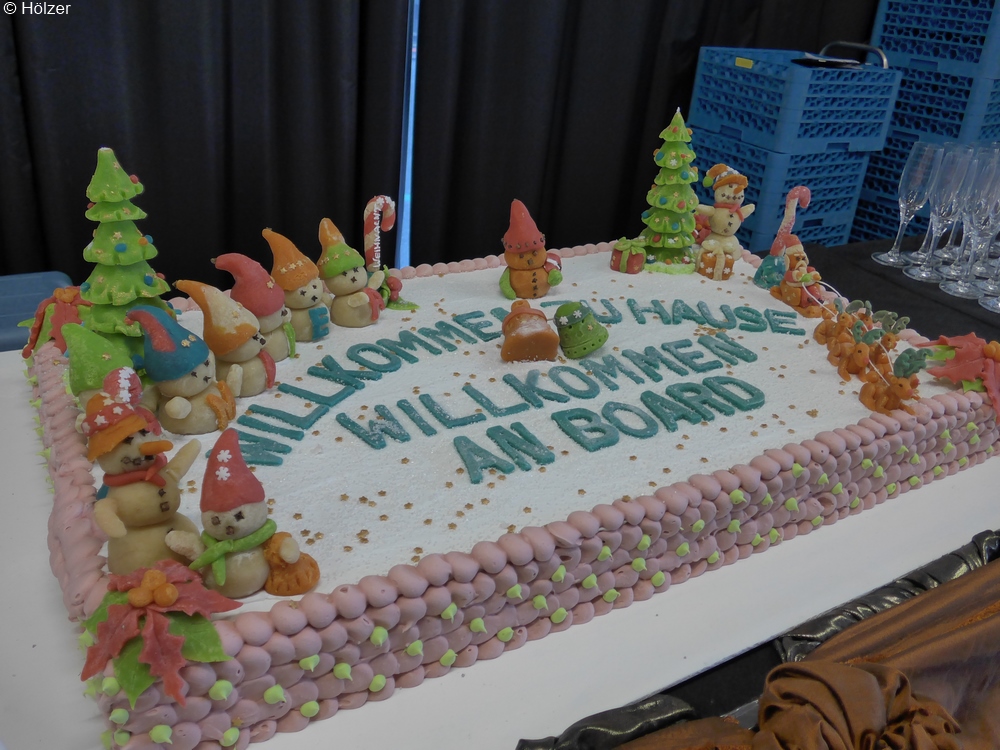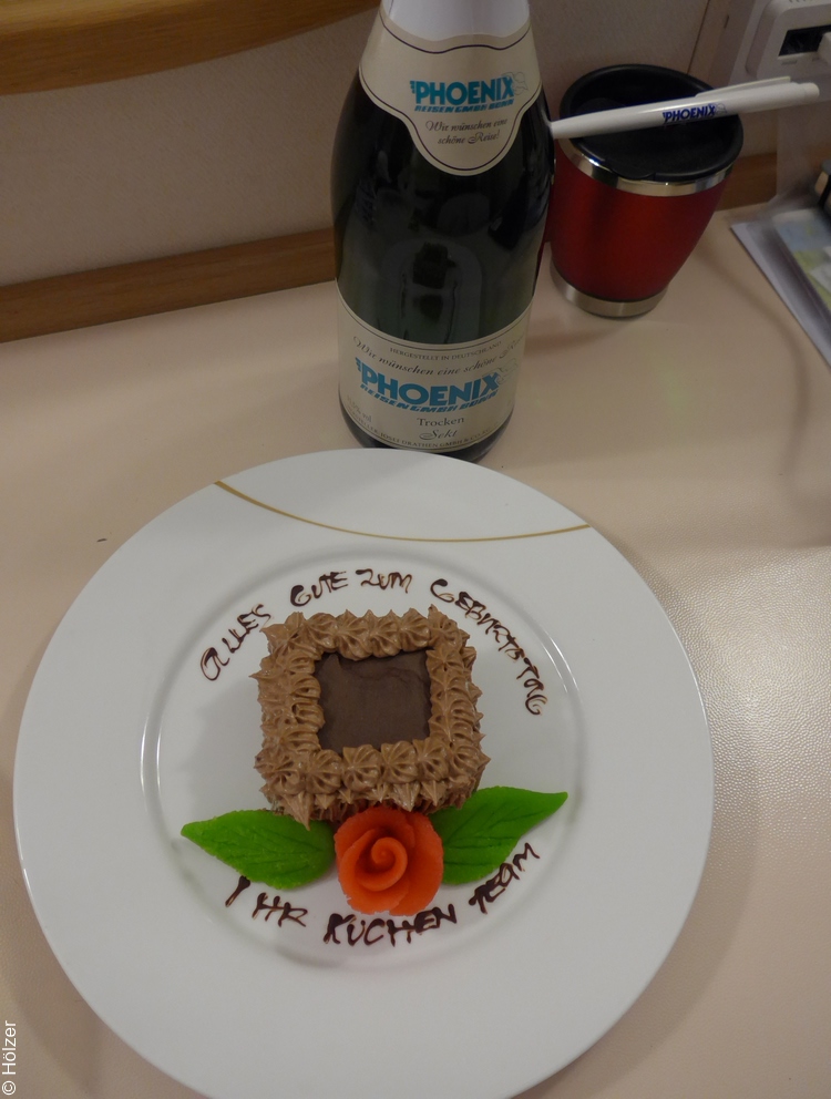 Das Küchenteam hat diese kleine Torte in unsere Kabine geschickt und das Duo V.I.P. (Apollonia und Harald) haben in Harry's Bar "Happy Birthday" gesungen.