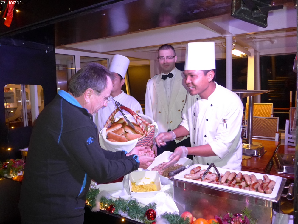 Das Abendessen bot sowohl den Klassiker, Würstchen mit Kartoffelsalat, als auch die gewohnten Abendmenüs der AMADEA-Schiffsküche. Die Weihnachtsgans sollte es übrigens erst am ersten Feiertag geben.
