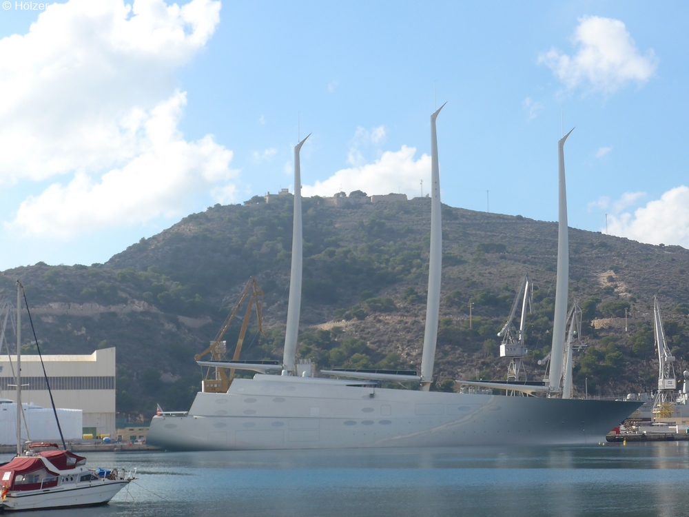Die "SY A", die größte und teuerste Segelyacht der Welt (400.000.000 $) liegt hier in Cartagena. Sie gehört einem russischen Oligarchen. Ich wette mal, dass er seine 11 Milliarden, die er besitzen soll, nicht ganz redlich erworben hat.