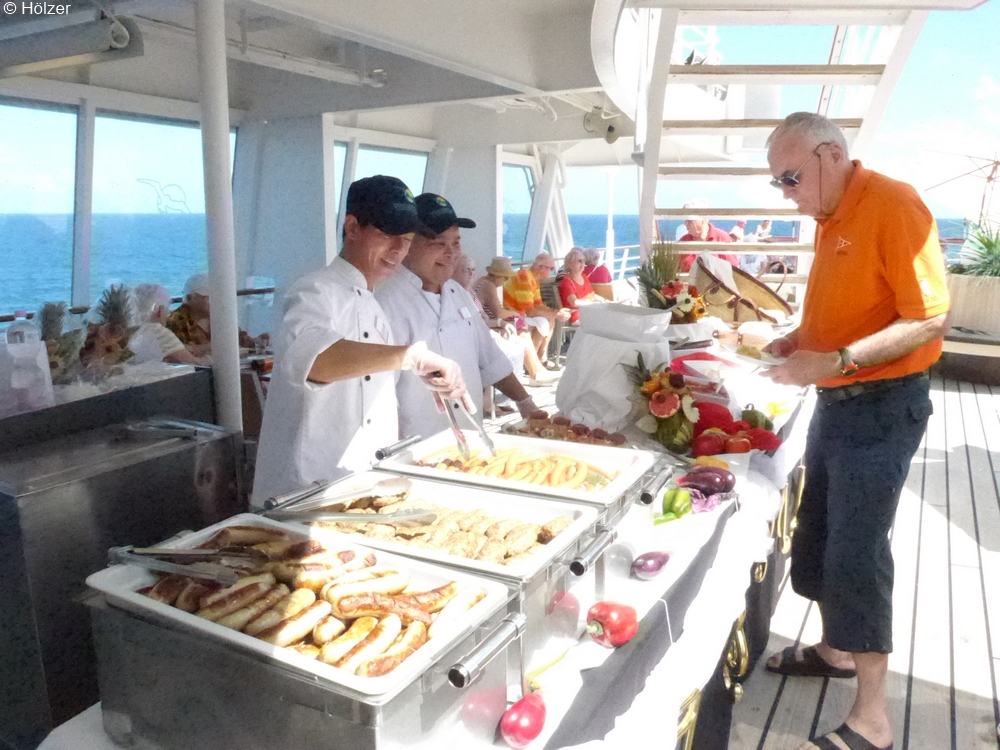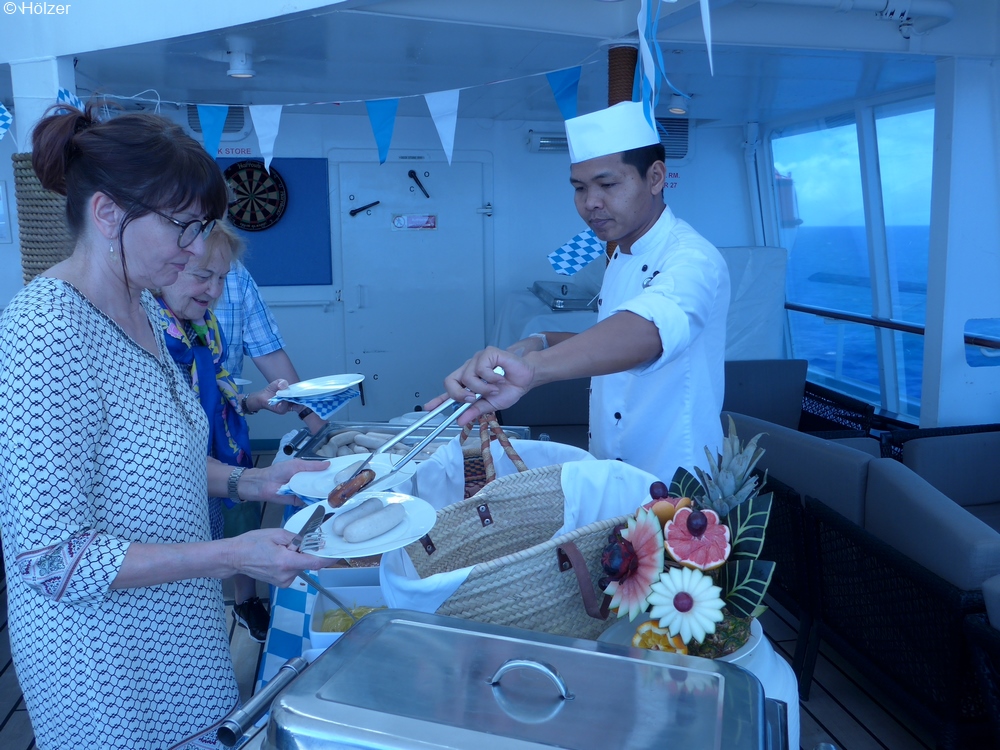 Um 11:00 Uhr gibt es achtern am Außendeck an der Jupiter Bar Weißwürste (gratis) und Weißbier (zum Sonderpreis), das Ganze untermalt von passender Stimmungsmusik von unserem bordeigenen DJ.