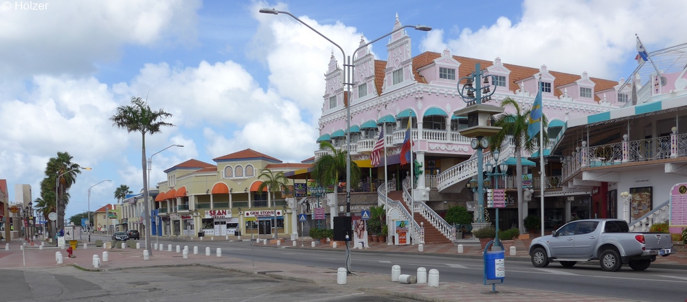 Früh um sechs Uhr kamen wir schon an, schließlich hatten wir ja keine große Strecke zurückzulegen. Aber um 12:30 Uhr sollte es auch schon wieder weitergehen. Dennoch hatten wir keine allzu große Eile, denn auch Oranjestadt lag auf unserer Route vor drei Jahren und wir wussten daher, dass der Ort nicht viel hergibt. Er erinnert so ein wenig an ein mit rosa Zuckerguss überzogenes Disneyland. Auch hier dominierten Schmuck- und Juweliergeschäfte.