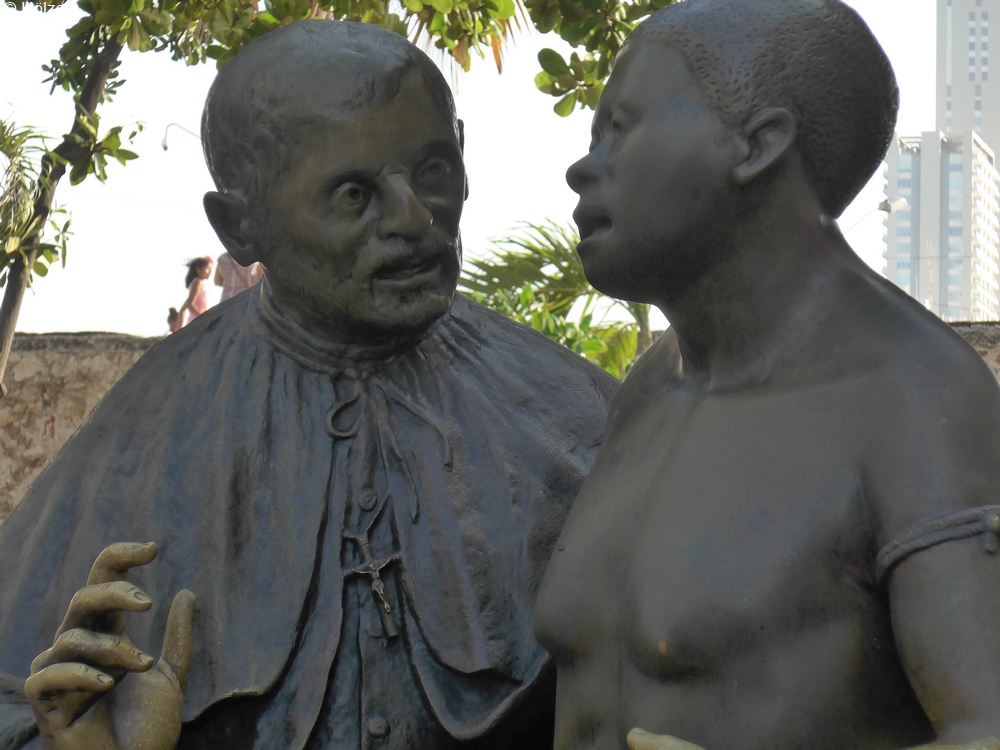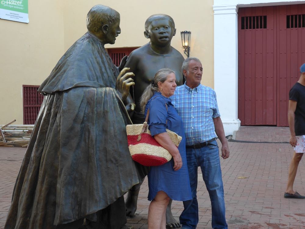 Vor der Kirche steht eine moderne Skulptur zu Ehren des Pedro Claver, die ihn und einen Sklaven darstellt. Auf einer Bank sitzend beobachteten wir amüsiert, wie sich immer wieder Touristen vor der Skulptur in Pose setzen und sich fotografieren ließen.