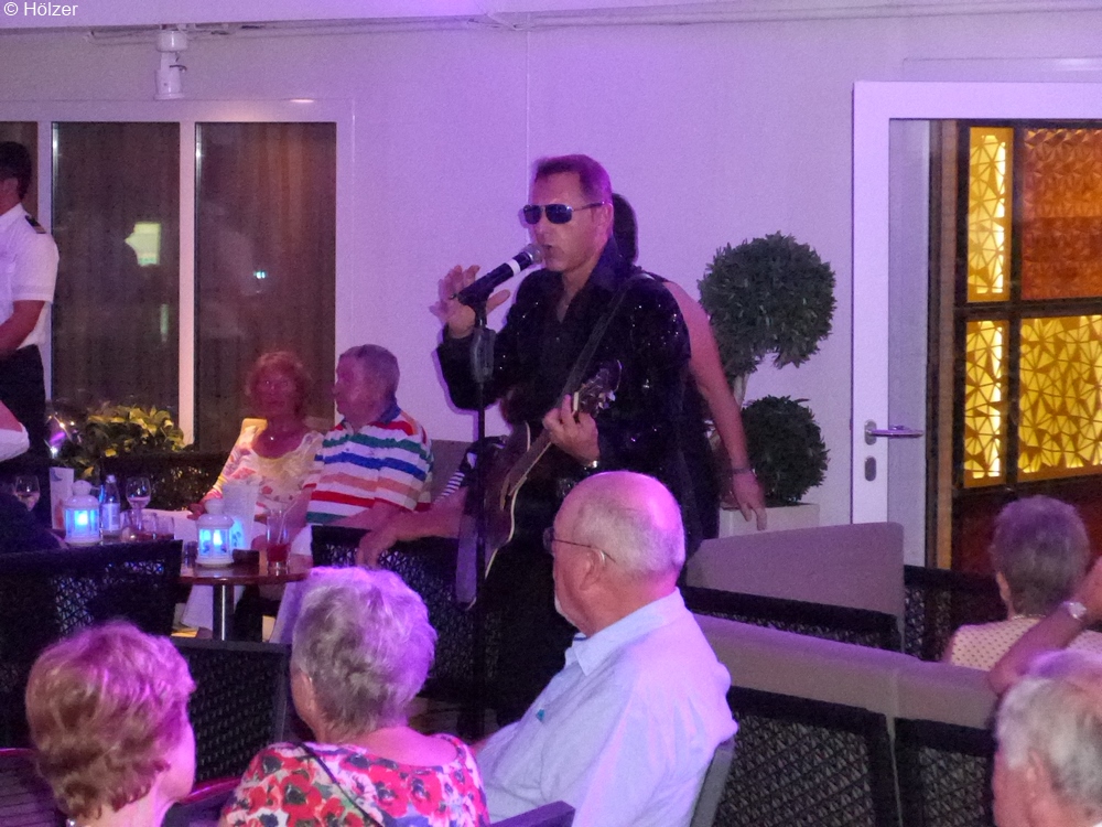 Um 22:30 Uhr, unter dem Motto "Elvis lebt", trat in der Jupiterbar, also am Außendeck achtern, ein Sänger auf, der eine halbe Stunde lang Songs und Hits des King of Rock 'n' Roll zum Besten gab und das nicht einmal schlecht. Das Deck war sehr gut besucht.
