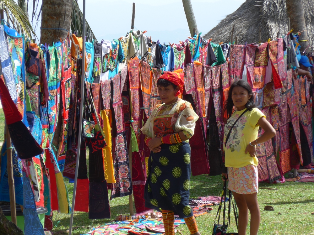 In der Mitte der Insel boten sie ihre Handarbeiten an, wie Taschen, bestickte Hemden und Blusen, Stoffbeutel und auch die sogenannten Molas. Molas sind, bunte bestickte Quadrate aus Stoff, die für Touristen als Souvenir und für die Kunas selbst als schmuckvolle Applikation für ihre Kleidung dienen.