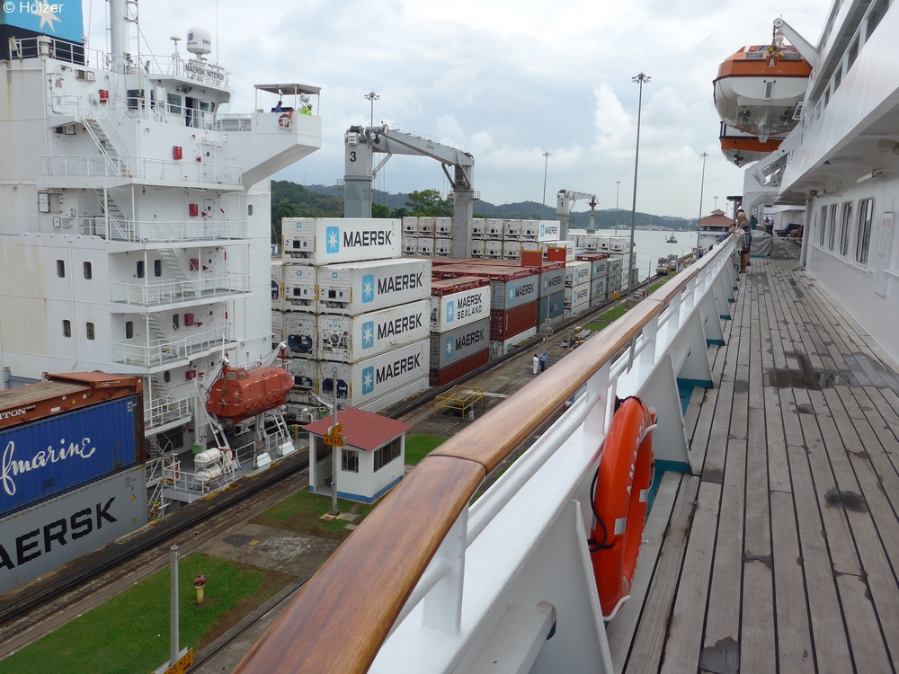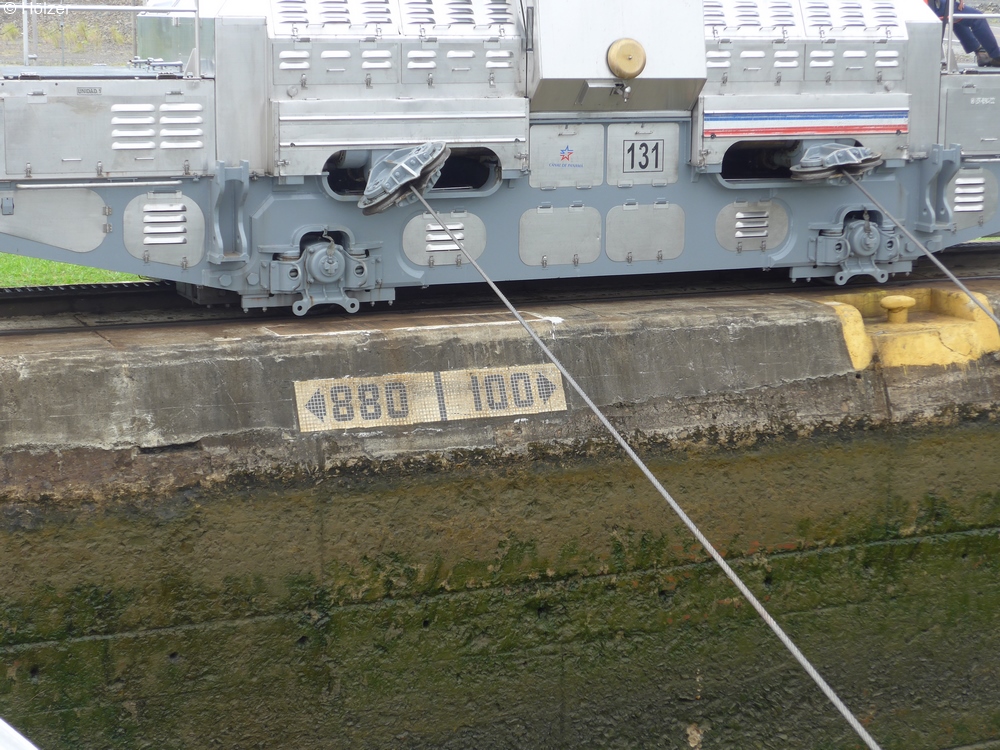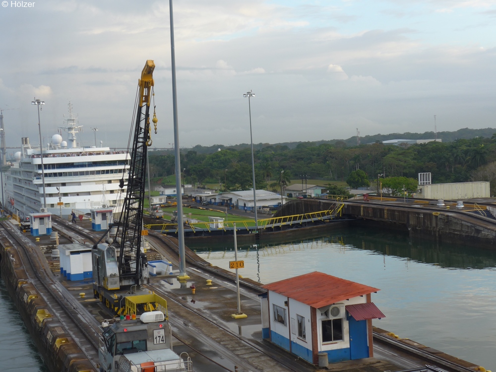 Doris hat dann zumindest gegen 7:00 Uhr die Einfahrt in die erste Schleuse, die Gatun-Schleuse mitbekommen, weil sie morgens als erstes ins Badezimmer geht. Ich stand zu dieser Zeit noch unter der Dusche. Wir wurden mit Hilfe von drei direkt aufeinanderfolgenden Schleusenkammern um 26 Meter auf die Höhe des Gatunsees angehoben.