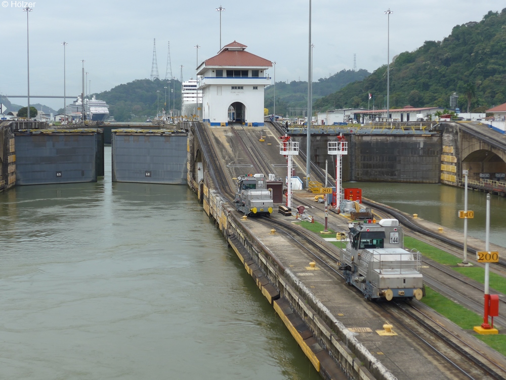 Nur kurz danach folgte die dritte und letzte Schleuse, die Miraflores-Schleuse, die aus zwei aufeinanderfolgenden Schleusenkammern besteht und uns um weitere16,5 Meter nach unten auf das Niveau des Pazifik brachte.