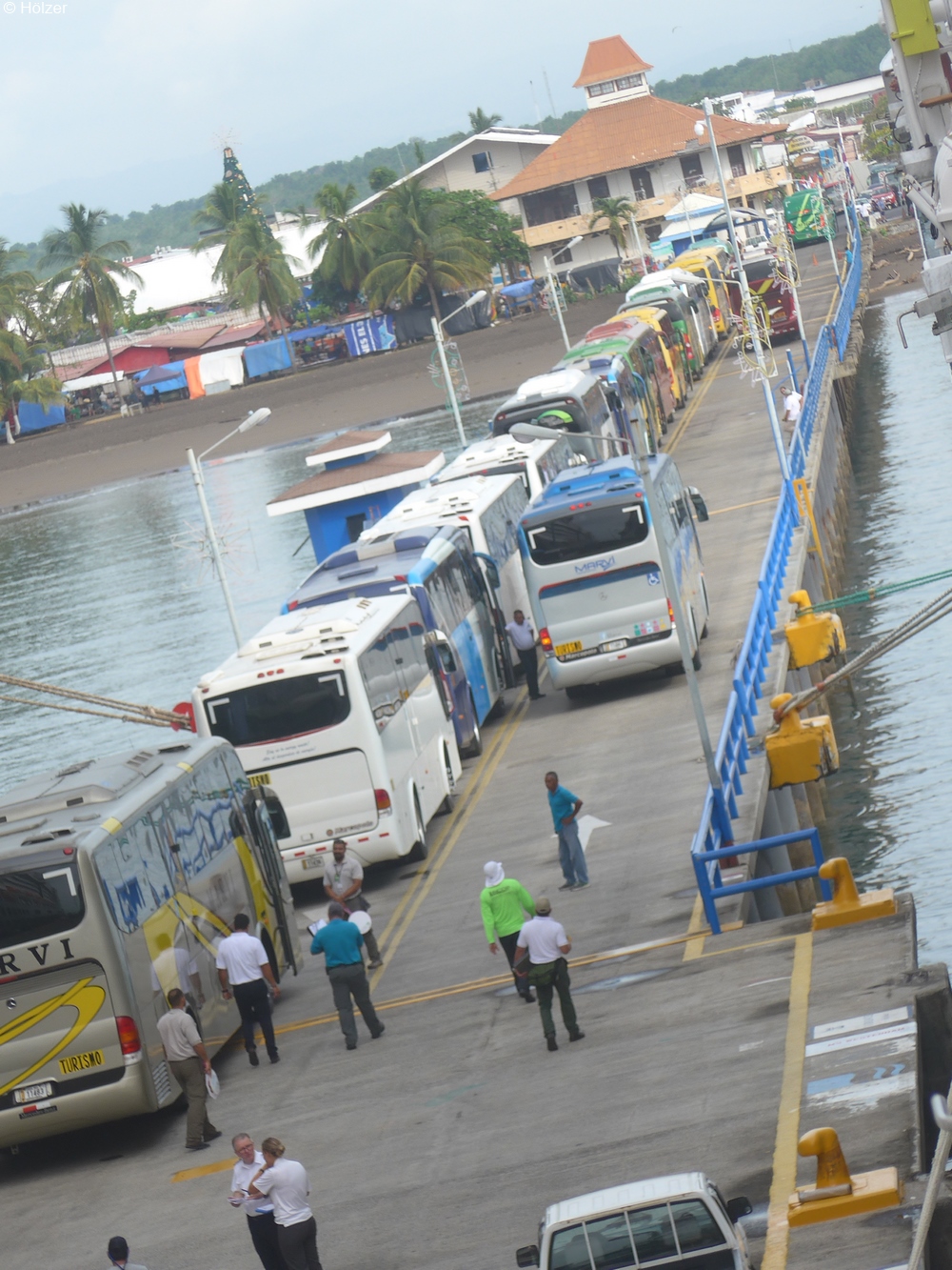 Zum Mittagessen ging es wieder zurück aufs Schiff. Eigentlich wäre jetzt für uns Puntarenas erledigt gewesen, denn um 15:00 Uhr sollten wir ablegen, um nach Puerto Caldera zu schippern, einem nur wenige Kilometer entfernten Containerhafen. Dort sollten wir vor Anker gehen und um an Land zu kommen, muss dann natürlich wieder getendert werden. In der Landgangsinformation von Phoenix über Puerto Caldera, fand man den Vorschlag, man könne mit dem Taxi nach Puntarenas fahren (15 Kilometer), also genau dorthin, wo wir gerade unsere exponierter Lage aufgegeben hatten. Da macht man sich so seine Gedanken über die Sinnhaftigkeit dieser Planung. Es wurde mehrfach vermutet, dass die Pier für ein anderes Schiff freigemacht werden muss. Und gleich ganz weiterfahren, statt vor einem absolut unattraktiven Gelände zu ankern ist deshalb nicht möglich, weil einige Ausflüge erst gegen 18:00 Uhr zurückkommen sollten und irgendwie musste man die Leute ja wieder an Bord bekommen.