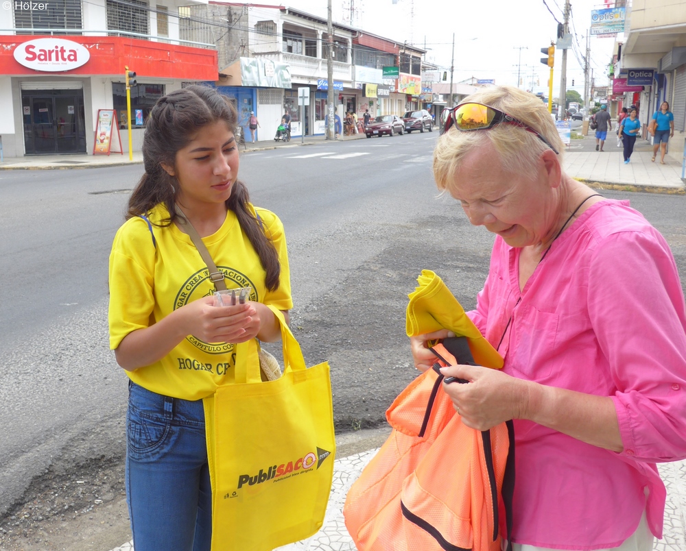 Die junge Dame verkaufte Kugelschreiber und Taschen für eine Oranisation (Hogar Crea Damas), die sich um Drogenabhängige kümmert.