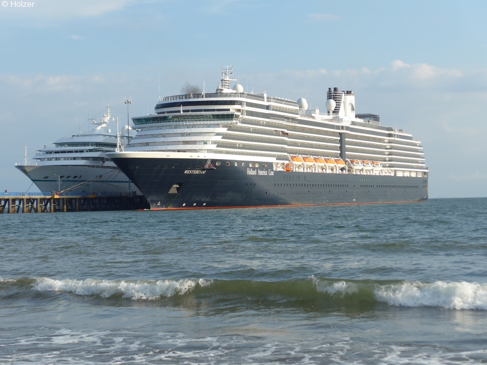 Als wir uns bequemten aufzustehen, stellten wir fest, dass wir nicht alleine an der Pier waren. Ein dicker Pott, die WESTERDAM von der Reederei Holland America Line, sie fuhr schon im Panamakanal direkt hinter uns, hatte jetzt ebenfalls hier festgenmacht. Das Schiff ist mit 2200 Passagieren viermal so groß wie unseres. Die WESTERDAM spuckte unentwegt Menschen aus und mehr als 20 Busse standen bereits aufgereiht auf der Pier; da fielen die paar Männeken von der AMADEA kaum ins Gewicht.