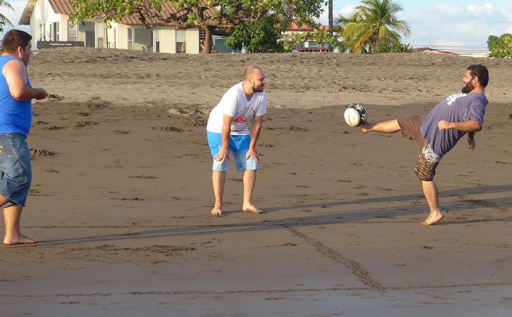 Strand-Fußball-Tennis: 2 Spieler, ein Schiedsrichter und das Spielfeld mit einem Stöckchen in den Sand gekratzt - fertig!