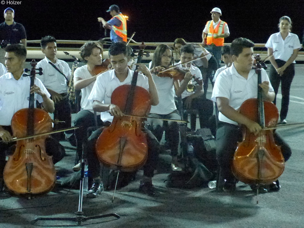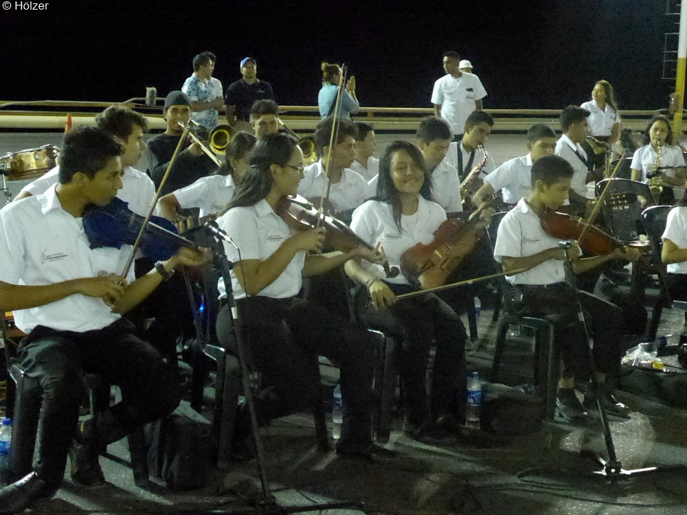 Abends um 20 Uhr brachte uns das örtliche Jugendorchester noch ein halbstündiges Ständchen, was etliche Passagiere noch mal vor das Schiff oder zumindest auf das Promenadendeck lockte. Die Bewohner der Balkonkabinen, vorausgesetzt, sie lag auf der richtigen Seite, in diesem Fall die Steuerbordseite, hatten es naturgemäß besonders bequem, dem Konzert beizuwohnen.