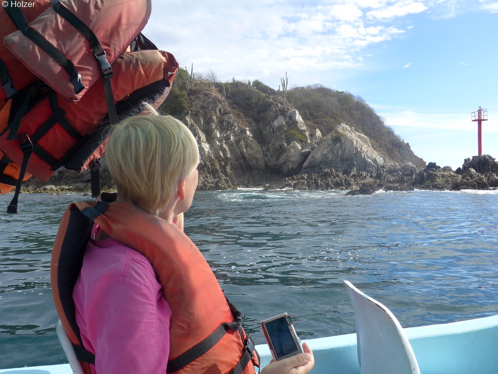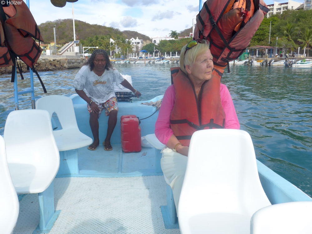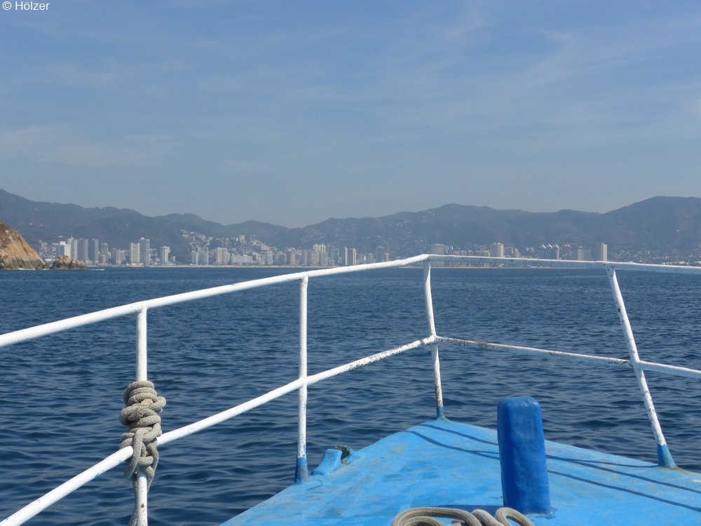 Am Badestrand angekommen, entließ das Schiff die badefreudigen Passagiere an Land. Die badeunfreudigen, also nur Doris und ich, fuhren wieder zum Ausgangspunkt zurück und genossen fast genau wie gestern die Exklusivität der Fahrt mit einem schönen Blick auf die Bucht von Acapulco und die Skyline der Metropole, während unser Felsenspringer das Deck schrubbte.