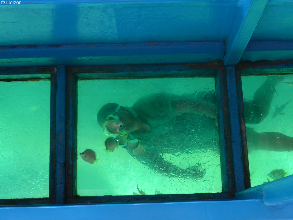 Damit war das Unterhaltungsprogramm aber noch nicht zu Ende. In der Mitte des Decks wurden jetzt Klappen geöffnet und gaben den Blick auf einen Glasboden frei. Ein weiterer Mensch tauchte unter das Boot und lockte mit einem Seeigel in der Hand einige bunte Fische an.