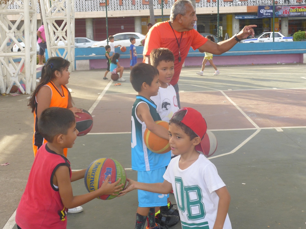 Auch hier verweilten wir länger. Etwa 10 Kids werden im Basketball trainiert. Der Trainer musste praktisch einen Sack Flöhe hüten.