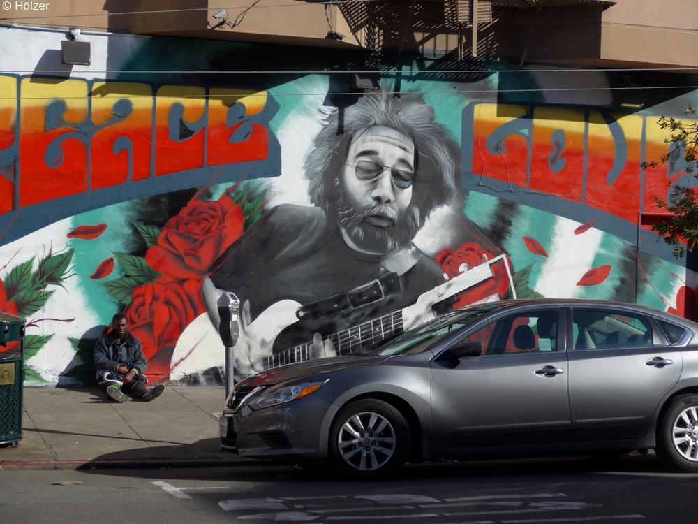 Auf diesem Wandgemälde ist neben Jerry Garcia auch Janis Joplin und Jimi Hendrix abgebildet. Den Totenkopf findet man im Original auf dem Plattencover einer Grateful Dead LP aus dem Jahr 1971.