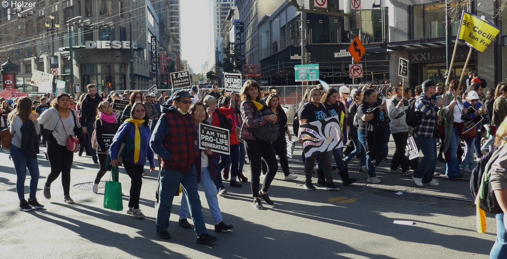Jetzt erst erkannte ich schlagartig den Grund für die Umleitung. Eine riesige Demo von Abtreibungsgegnern, die die Market Street entlang Richtung Waterfront zogen, ließen keinen Busverkehr mehr zu. Auch "meine" Nummer 9 konnte hier nicht mehr fahren.