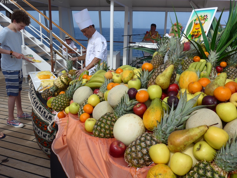 Da wir erst um 14:00 Uhr in unserem ersten Hafen auf Hawaii ankommen sollten, war am Vormittag noch Zeit für einen Frühschoppen, der unter dem Motto "Es gibt kein Bier auf Hawaii" stand. Praktisch 2 ½ Stunden Happy Hour (Bier zum halben Preis auf den hinteren Außendecks), Musik von unserem DUO V.I.P. und allerlei zum Essen (z. B. Hawaii-Burger).