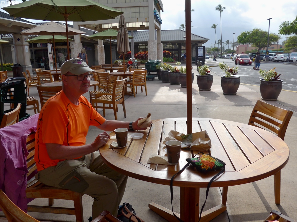 In einem riesigen Supermarkt konnten wir uns überzeugen, dass die Lebenshaltungskosten auf Hawaii sehr hoch sind. Aber für einen Coffee to Go und ein Cookie für jeden von uns hat es noch gereicht und wir nahmen an einem Tisch im Freien Platz und vertrödelten genussvoll den Nachmittag.