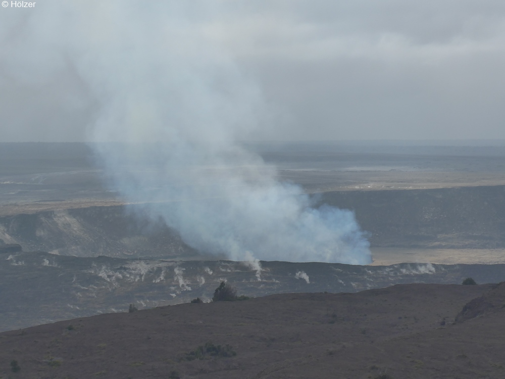 Die Busfahrt ging weiter durch grüne üppige Vegetation zum Hauptziel, dem Hawai'i Volcanoes-Nationalpark. Hier konnten wir einen riesigen rauchenden Krater des Vulkans Kilauea erblicken. Kilauea bedeutet in der Sprache der Hawaiianer so viel wie spucken oder erbrechen. Dann kann man folgerichtig die umherliegenden Lavagesteine letztlich auch als Kotzbrocken bezeichnen.