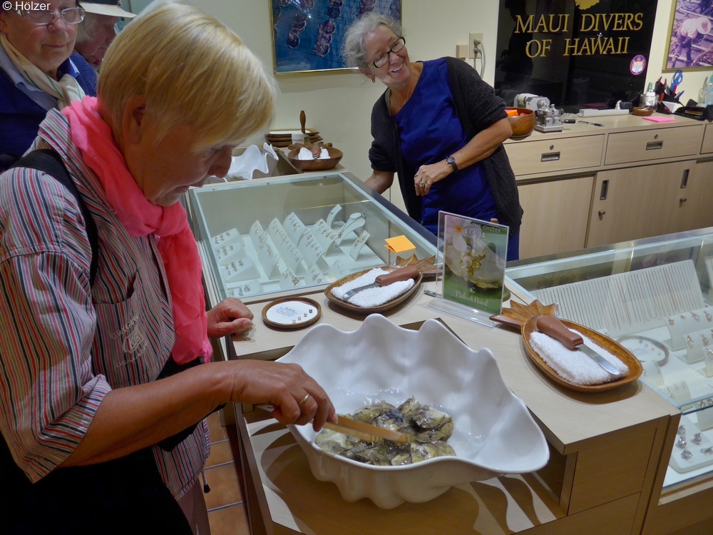 Auch uninteressant. Doch halt, in der erwähnten Schmuckabteilung konnte man für 15 $ eine Auster kaufen, die garantiert eine Perle enthalten sollte. Das Ganze war noch verbunden mit einer Rabattlotterie. Doris beschloss, dass sie so eine Perle haben möchte. Zunächst durfte sie ein Los ziehen und siehe da - 50% Rabatt. Sie suchte sich eine Auster aus, hätte sie auch selbst knacken dürfen, überließ das aber lieber der netten Dame hinter dem Tresen.