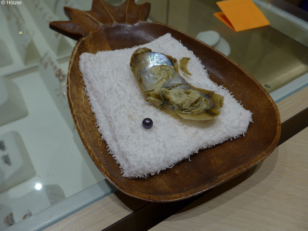 Diese Perlenaktion zum Schnäppchenpreis hatte natürlich einen tieferen Sinn. Es gab Ketten, Ohrringe und Ringe, in die man die selbstgefangene Perle hätte einfassen lassen können. Und hier wäre dann das eigentliche Geschäft gemacht worden, indem man einfachen Silberschmuck zu horrenden Preisen feil bot. Wir beließen es deshalb bei "Perle pur".