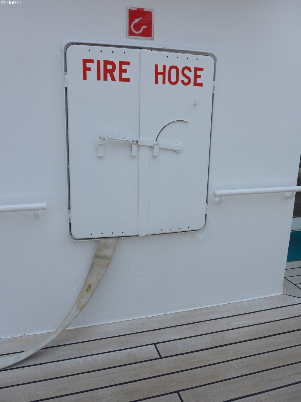 Weiter wurden auf dem Promenadendeck überall Feuerwehrschläuche verlegt und deren Spritzdüsen an der Reling befestigt, um gegebenenfalls als Wasserwerfer potentielle Angreifer zu vertreiben.