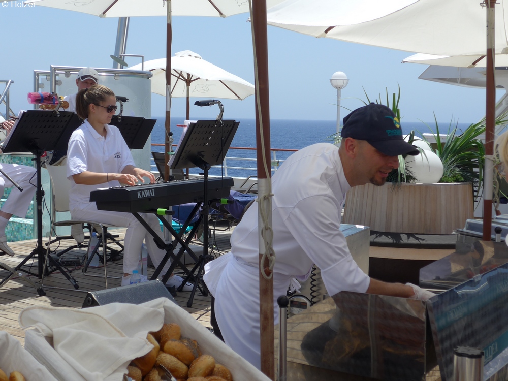 Begonnen hatte die kalorienreiche Abfolge mit dem Jazzfrühschoppen, achtern auf dem Pooldeck. Bratwurst und/oder Cevapcici und Bier zum halben Preis.