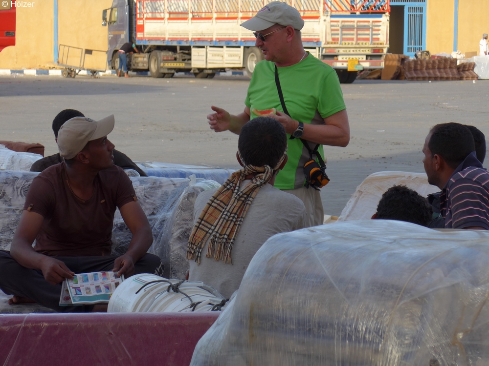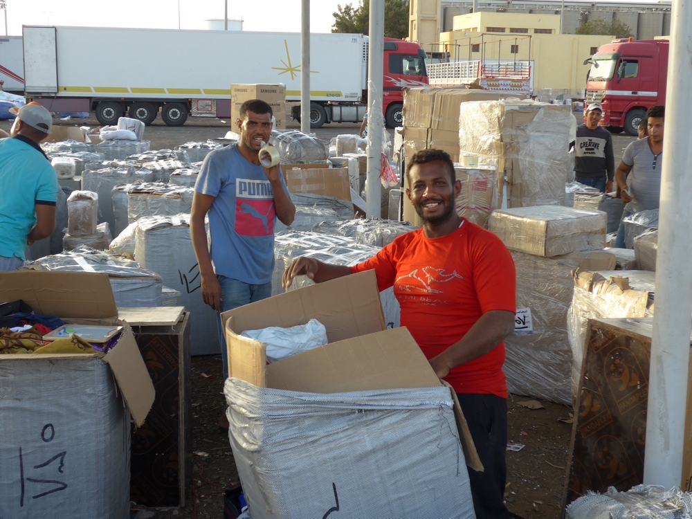 Die Waren werden verpackt, damit man sie transportieren kann, werden auf LKWs verladen (das konnten wir beobachten) und mit einer Fähre an die Ostküste des Roten Meers nach Saudi-Arabien gebracht und gelangen von dort auf dem Landweg zu den eigentlichen Bestimmungsorten (das ist unsere Vermutung).