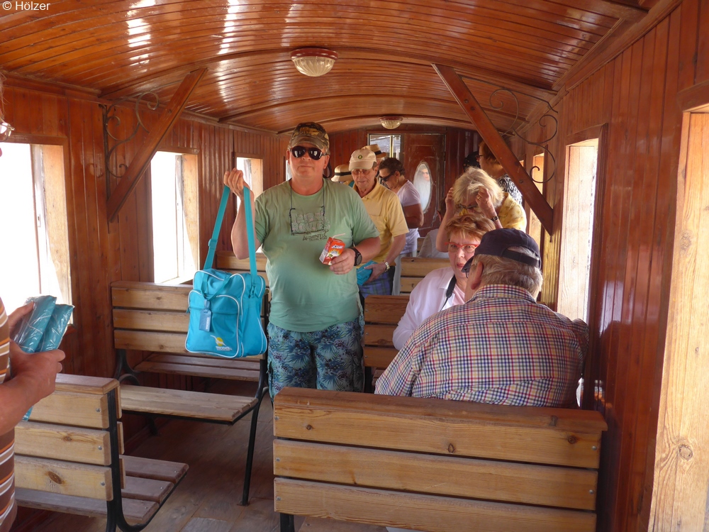 Wir hatten, die Wahl entweder in einem Personenwaggon in einer echten Holzklasse zu reisen oder auf einem offenen Wagen, auf Sandsäcken sitzend, die Fahrt zu genießen. Auf diesem offenen Waggon waren zwei Lafetten für Maschinengewehre montiert, die Gewehre hat man aber weggelassen. "Bewacht" wurden wir von uniformierten Soldaten mit altertümlichen Schießprügeln.