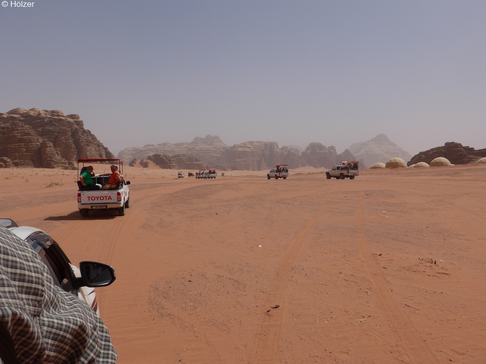 Mit 3 Bussen fuhren wir los, raus aus der Stadt und hinein in das Gebiert des Wadi Rum. Das Wadi Rum ist eine geschützte Wüstenwildnis (UNESCO Weltkulturerbe) und ist eines der wichtigsten Ziele inJordanien, neben der Felsenstadt Petra.