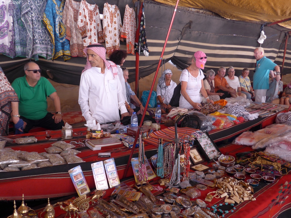 Tatsächlich fuhren wir nur gut eine Stunde. Denn mit Kamelreiten (25$ für 15 Minuten) und Teetrinken im Beduinenzelt mit ausgiebigem Souvenirverkauf wurde viel Zeit verdaddelt.