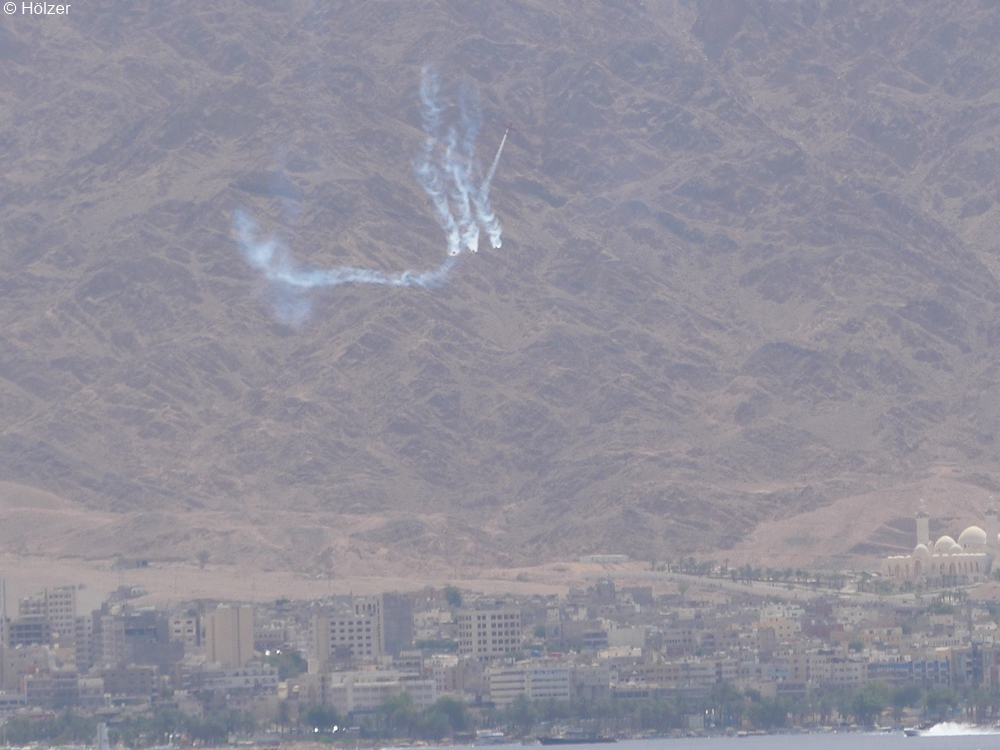 Als die Fahrt losging, waren wir nicht von Wind, Wellen und Meer gefesselt, sondern von waghalsigen Flugmanövern, die eine jordanische Flugstaffel im gebirgigen Hinterland von Aqaba vollführte. Im Sturzflug herabtrudeln und die Maschine wieder abfangen oder Formationsflüge entlang der steilen Gebirgshänge, uns blieb einfach die Spucke weg. Aber auch die Katastrophe von Ramstein während eines dortigen Flugtags kam wieder in Erinnerung.