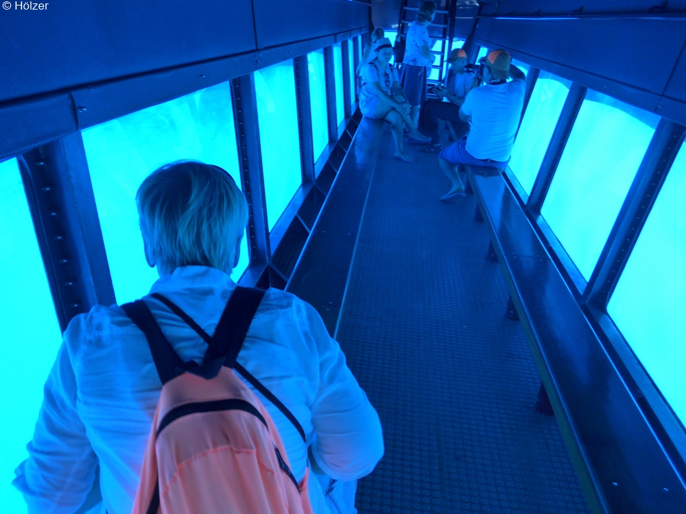 Wir befanden uns hier unter der Wasseroberfläche und kamen uns vor, wie in einem U-Boot. Das bläuliche Licht sorgte zusätzlich für eine ganz eigenartige Atmosphäre, was allerdings einigen der Kinder Angst einflößte und sie zu weinen anfingen.