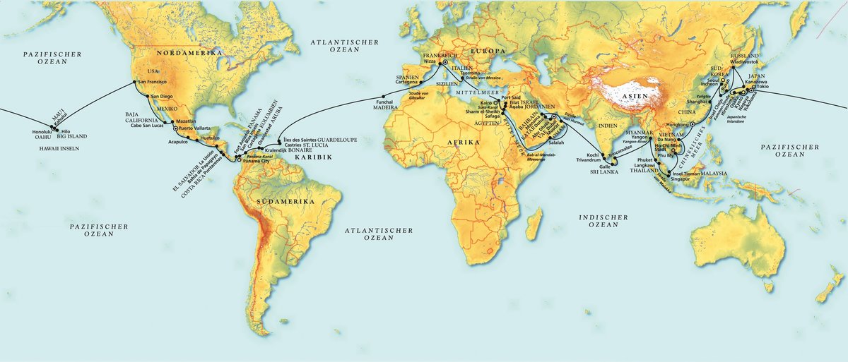 Diese Weltumrundung mit Anfang und Ende an der südfranzösischen Küste hat es in sich. Auf den Spuren früherer Entdecker nehmen Sie Kurs auf die Karibik. Mehreren Inselstopps folgt die Fahrt durch den Panama-Kanal. Nun genießen Sie die Vielfalt Lateinamerikas zwischen Costa Rica und Mexiko, bevor Kalifornien in Sichtweite ist. Einem ausgedehnten Besuch San Franciscos folgen die Hawaii-Inseln, um dann über die Datumsgrenze Kurs auf Japan zu nehmen. Die Top-Highlights des fernen Ostens und Südostasiens stehen nun auf dem Programm. Tokio, Wladiwostok, Shanghai und Hongkong folgen Ziele in Vietnam, Malaysia und Myanmar. Vom Land der Goldenen Pagoden aus steuert MS Amadea Sri Lanka und Indien an, um sich danach ausgiebig den Emiraten im Persischen Golf zu widmen. Rund um die arabische Halbinsel gelangen Sie schließlich mit Stopps im Golf von Aqaba durch den Suez-Kanal zurück nach Europa.
