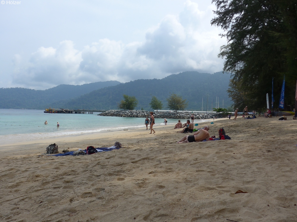 Gegen 10 Uhr fuhren wir mit dem Tenderboot an Land, um uns irgendwo am Strand niederzulassen und zu schwimmen. Da für Tioman von Phoenix gar keine Ausflüge angeboten wurden, waren die Strände fest in der Hand der Phoenix-Kreuzfahrer.