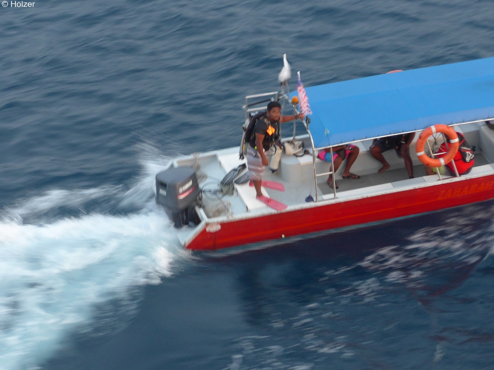 Allerdings hatten wir während der Busfahrt einen langen Steg gesehen, an dem ein gutes Dutzend von kleinen Ausflugsbooten lagen. Dort müsste man doch eines der Boote chartern können, um ein wenig zwischen den Inselchen zu schippern. Allerdings war es bis dorthin gut ein Kilometer, eine Strecke, die man ganz gut laufen kann, wenn es nicht so furchtbar heiß wäre. Die Taxifahrer, die vor der Gangway der AMADEA auf Kundschaft lauerten, wollten Inseltouren mit ihren PKW an den Mann bringen- eigentlich. Um sie abzuwimmeln erzählten wir ihnen, dass wir eine Bootstour machen wollten. Kein Problem, auch hierfür zeigte sich ein Taxler zuständig. Wir wollten eine Tour von etwa 1 ½ Stunden machen und hatten intern eine Preisvorstellung von ca. 50-US-Dollar. Sein erstes Angebot lautete 120 $, wobei wir sofort die Verhandlung abbrachen, um uns auf den Weg zu den Booten zu machen, um dort direkt zu verhandeln. Unser gemurmeltes "50 $ und keinen Cent mehr" verstand er als unser Angebot und akzeptierte. Wir waren wieder im Geschäft. Im Preis enthalten war auch die Taxifahrt zu dem besagten Bootssteg. Dort verhandelte der Taxifahrer jetzt erst mal mit eine Frau, die für ein bestimmtes Boot zuständig ist. Das Ergebnis dieser Verhandlung wird uns mitgeteilt. Der Fahrpreis beträgt 55 $, darunter wäre nichts zu machen. Der Taxifahrer zuckt bedauernd mit den Schultern und wir zahlten.