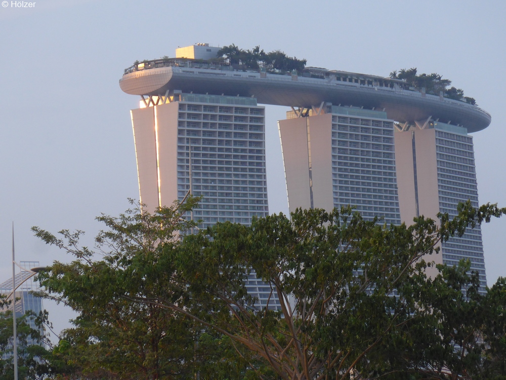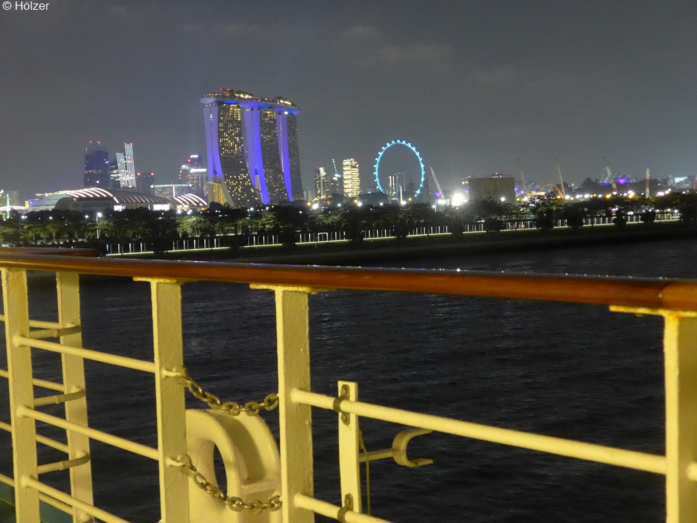 Nach Einbruch der Dunkelheit konnte man von unserem Schiff aus noch einen schönen Blick auf die Skyline mit dem markanten Marina Bay Sands Hotel und dem Riesenrad, dem Singapore Flyer, werfen. Das Riesenrad war übrigens gerade wegen nicht näher genannter technischer Probleme außer Betrieb.