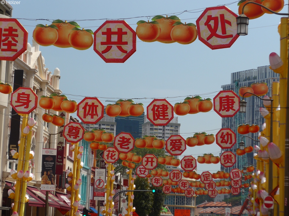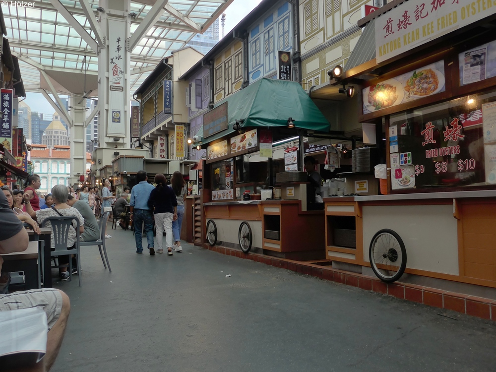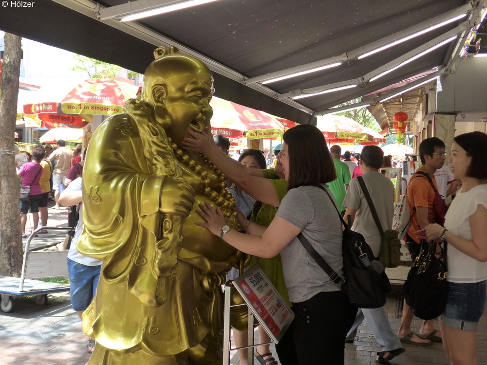 China Town hatten wir deswegen auf unserem Zettel, weil wir dort zu Mittagessen wollten. Zielstrebig trabten wir zur Smith Street, die als Food Street bekannt ist. Hier hatten wir schon letztes Jahr ganz gut gegessen. Also kauften wir wieder am gleichen Stand für 6 Singapur- Dollar (knapp 4 Euro) unser Essen. Doris wählte Reis mit Ente und ich Reis mit knusprigem Schweinefleisch.