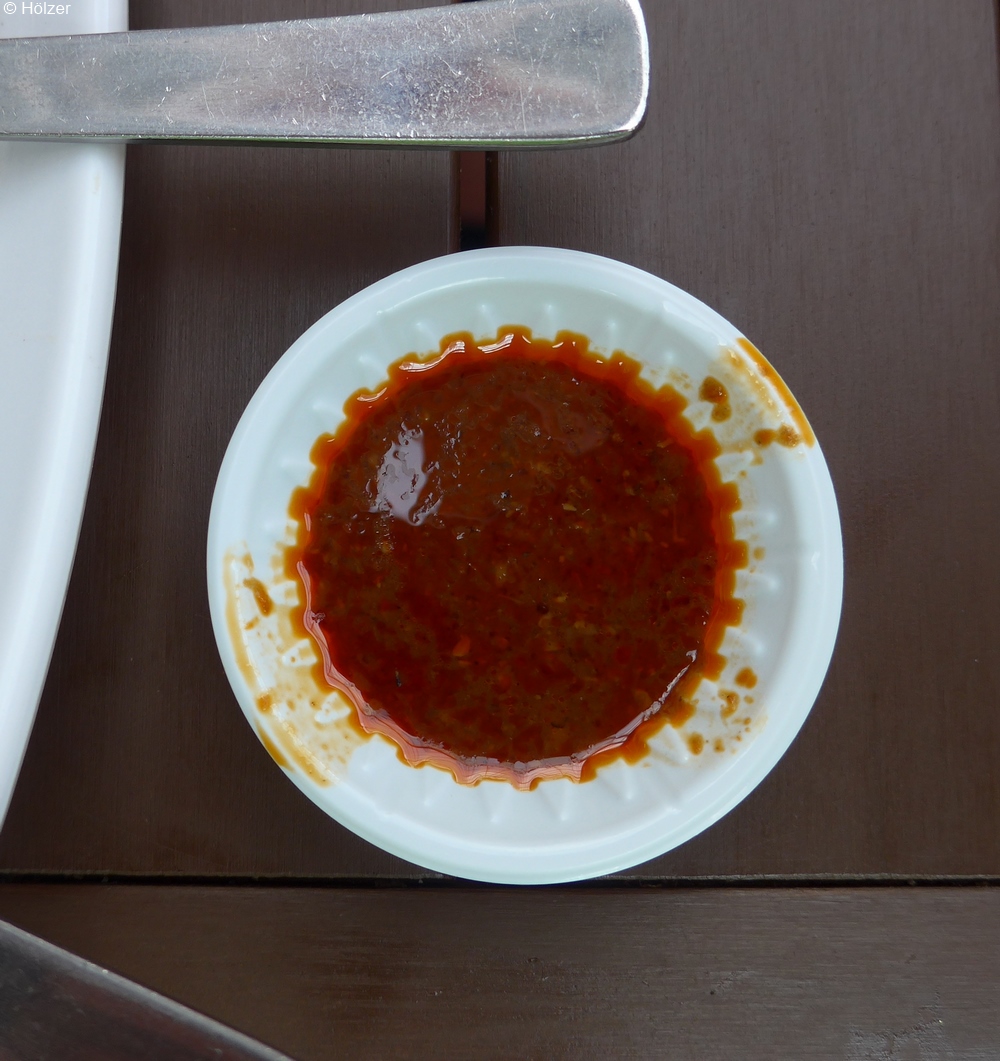 Doris machte allerdings den Fehler, dass sie sich noch ein kleines Schälchen mit lecker aussehender roter Soße, der Ketchup-Soße für Currywurst nicht unähnlich, geben ließ. Als sie allerdings, wenn auch nur eine kleine Menge, davon probierte, war das Mittagessen schon beinahe wieder vorbei. Sie hatte die berühmte und in Asien weit verbreitete Fischsoße erwischt und den intensiven für europäische Zungen nur schwer zu ertragenden Geschmack konnte sie nur mit viel Cola wieder wegspülen.