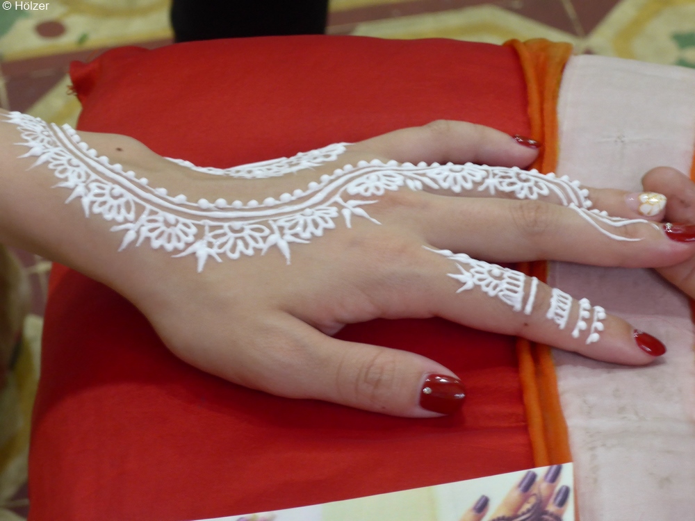 Innerhalb einer Viertelstunde kann man sich kunstvolle Henna-Tatoos auf die Haut malen lassen. Die Tatoos halten bis zu zwei Wochen (und ja, man darf sich auch waschen).