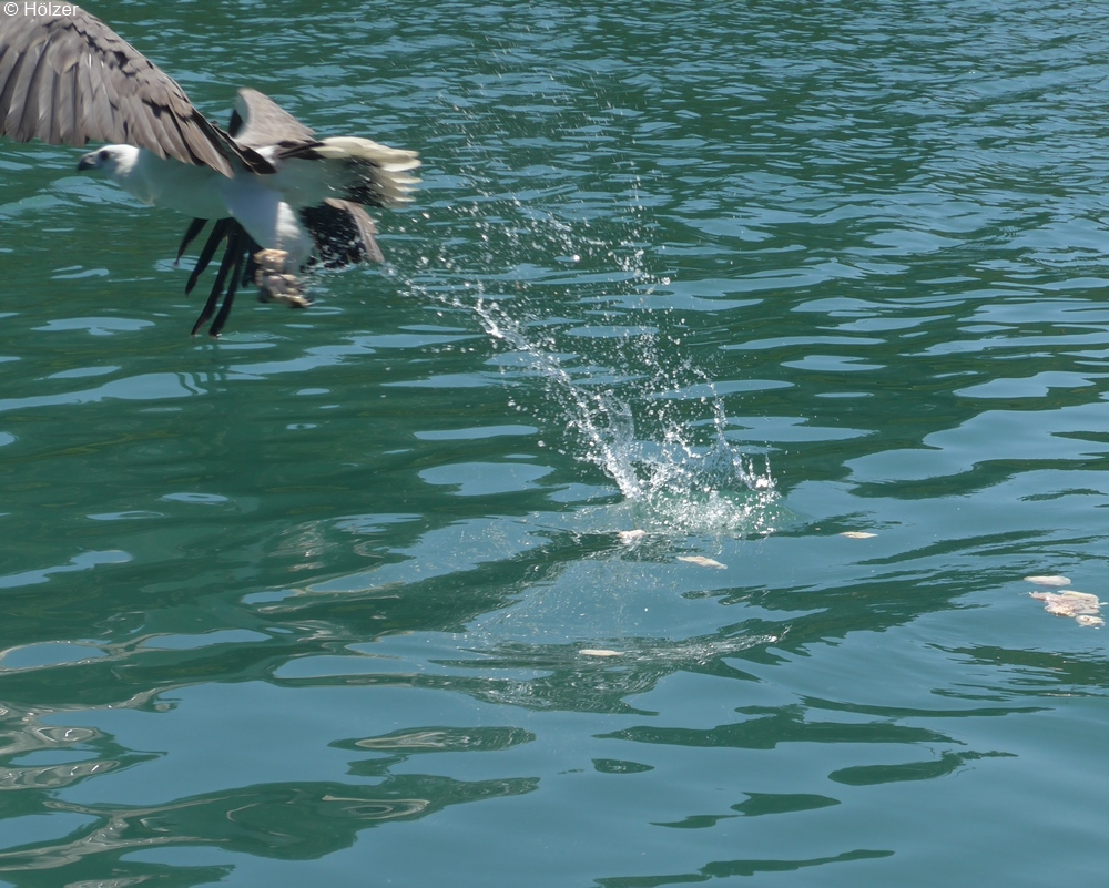 Unser Skipper kippte ein paar Fleischbrocken direkt neben das Boot und die Adler kamen, um die Beute abzugreifen.