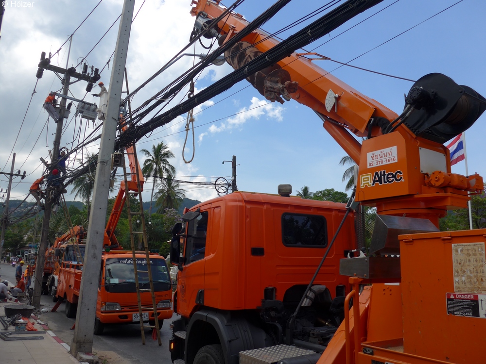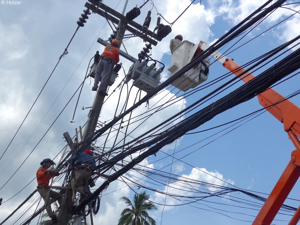 Am spannendsten war eigentlich, einigen Arbeitern bei Arbeiten auf einem Strommast zuzusehen, die in dem vorhandenen Kabelchaos irgendetwas zu verrichten hatten. Waren ursprünglich 3 Männer mit Steigeisen und Bambusleitern zu Gange, konnten wir auf dem Rückweg unseres Spaziergangs, als wir wieder an der Stelle vorbeikamen, die dreifache Manpower und drei Hubwagen zählen.