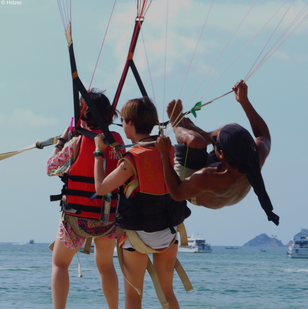Hier am Strand gibt es einen "Flugbegleiter", der nachdem der Schirm das erste Stück gestiegen ist, sich affenartig in ein Konstrukt aus Stricken am Gleitschirm windet und ungesichert ohne Netz und doppelten Boden mitfliegt, um den Schirm während des Flugs zu steuern und für eine gezielte Landung am Strand zu sorgen.
