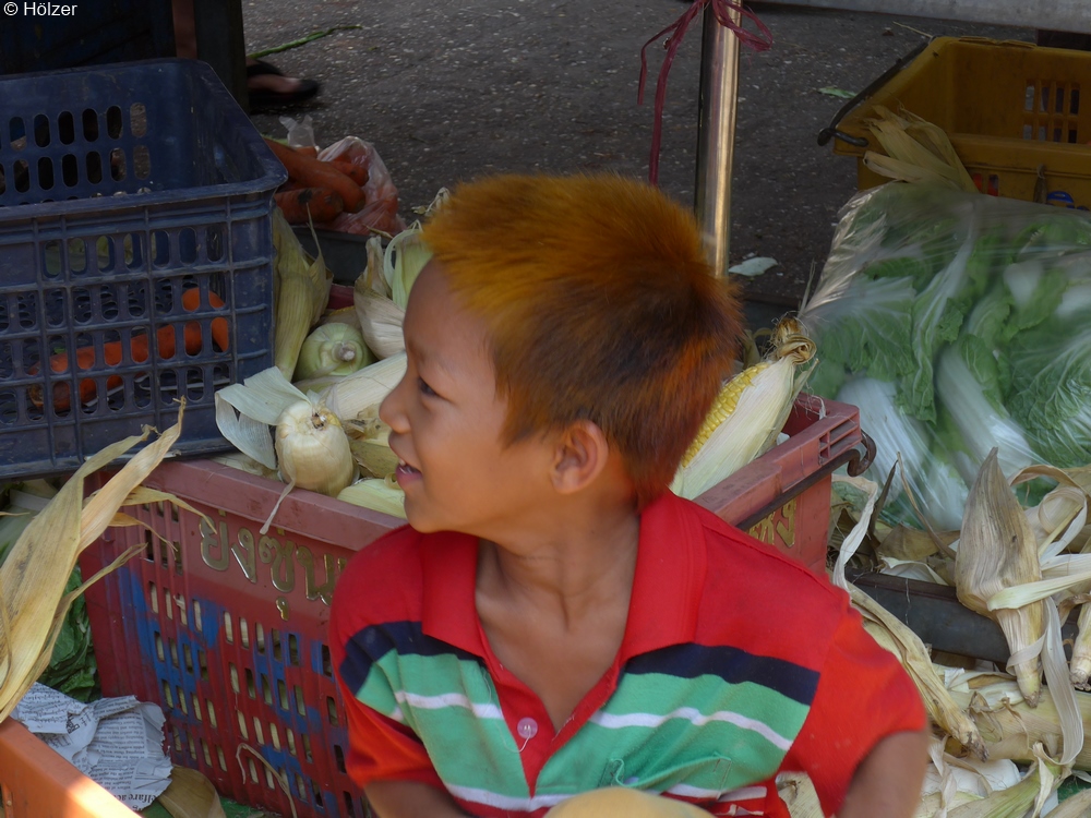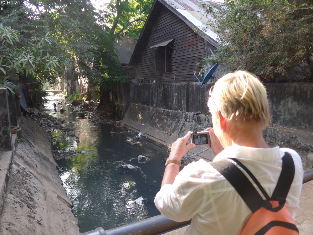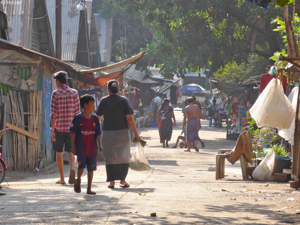 Zwar mit Stadtplan, aber ansonsten ohne konkreten Plan bogen wir in Bahnhofsnähe in ein beliebiges Sträßchen ein. Wir landeten in einer Siedlung mit Holzhütten und Holzhäusern, wo die Leute lebten und kleine Geschäfte, wie Garküchen, Stände mit Süßigkeiten, Getränken, Obst und Fisch betrieben.