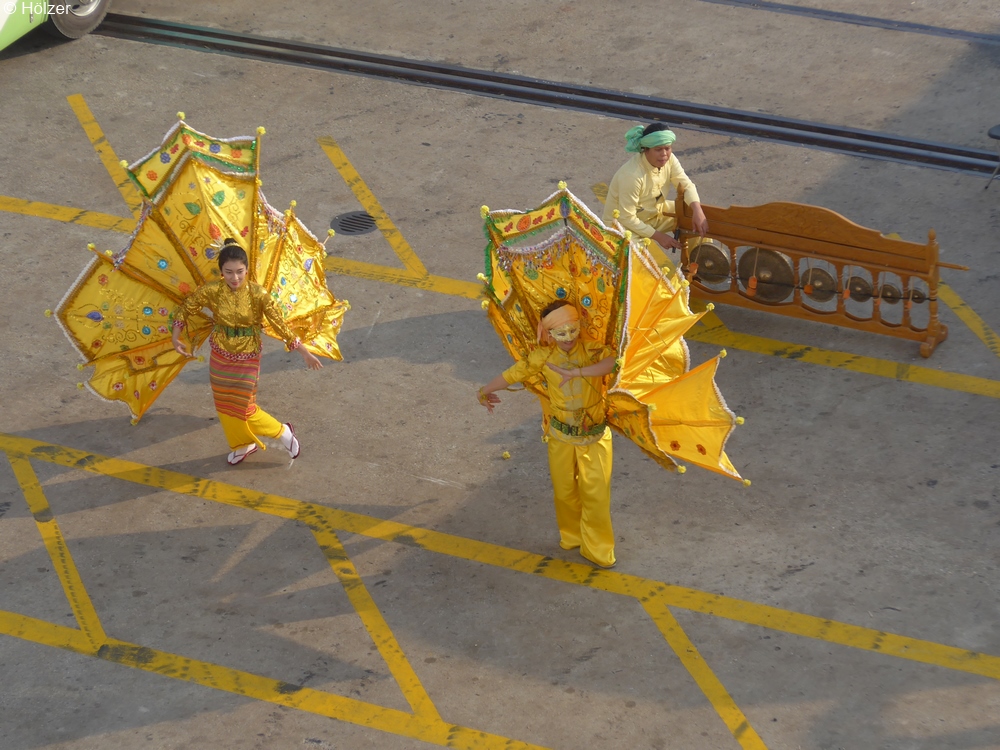 Leider lag der Industriehafen, in dem wir an der Pier lagen, völlig abseits. Vor dem Hafengelände, wohin uns am Vormitttag ein kleiner (kostenloser) Shuttlebus brachte, gab es absolut nichts. Lediglich eine handvoll Taxifahrer boten Touren in die Hauptstadt Yangon (frühere Bezeichnung: Rangun) an. Also shuttleten wir gleich wieder zurück zum Schiff.