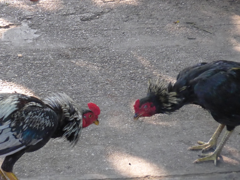 Kampfhähne. Die Besitzer ließen die Tiere wohl zu Trainingszwecken aufeinander los. Der Kampf war zum Glück unblutig und ging unentschieden aus.