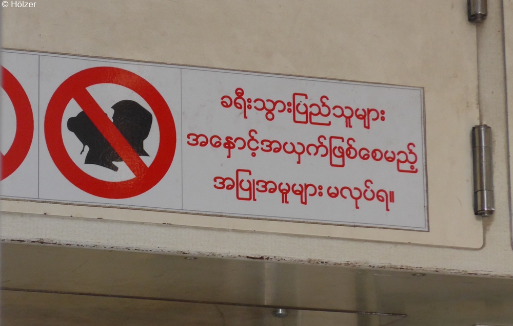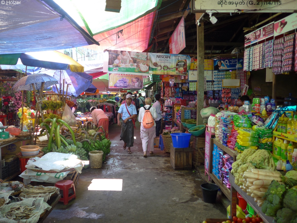 Noch einmal nach Yangon, ob mit dem Taxi oder dem Transferbus schied aus, weil uns die lange Fahrt für die relativ kurze Strecke abschreckte. Wir hätten einen großen Puffer für die Rückfahrt einbauen müssen, damit wirbis spätestens 16 Uhr wieder an Bord wären, um unseren Dampfer nicht zu verpassen.