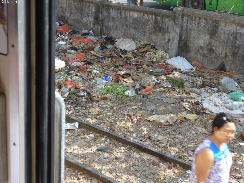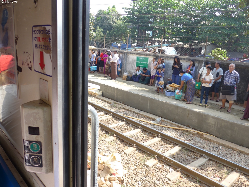 Die knapp einstündige Zugfahrt war dennoch hochinteressant. Fenster und Türen waren während der Fahrt offen, sodass man gut sehen und fotografieren konnte, als der Zug durch die Vororte von Yangon ratterte.