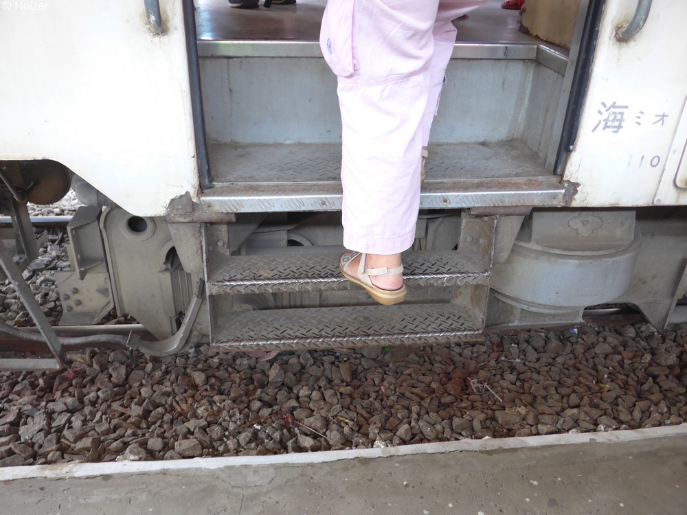 Bevor wir zum Bahnsteig geführt wurden, wurde ein technischer Halt bei den Bahnhofstoiletten eingelegt, von deren Benutzung uns gestern noch unsere örtliche Reiseleiterin so dringend abgeraten hatte. Aber in der Not frisst der Teufel Fliegen und so schlimm war es gar nicht. Die Toiletten waren zwar alt, marode und schäbig, aber sauber. Und es kostete Eintritt, wobei das größte Problem war, dass die Meisten gar keine einheimische Währung in der Tasche hatten.